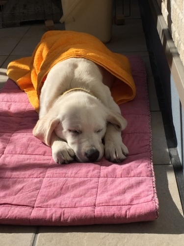 わたちがスネて、ベランダで寝るからって、おかあたんが敷物とタオルをくれたの❤️